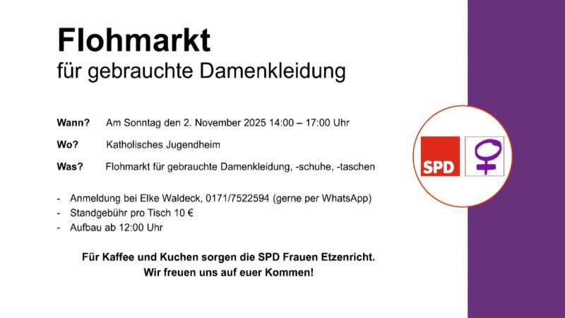 Nach den großen Erfolgen der letzten Flohmärkte veranstalten die SPD Frauen wieder den beliebten Flohmarkt für Damenkleidung. Im …