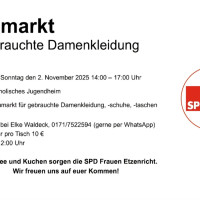 Nach den großen Erfolgen der letzten Flohmärkte veranstalten die SPD Frauen wieder den beliebten Flohmarkt für Damenkleidung. Im katholischen Jugendheim in Etzenricht können am Sonntag, den 2. November 2025 Interessierte nach Schnäppchen und Schätzen suchen. Beginn ist um 14 Uhr, Ende um 17 Uhr. Anmeldung für interessierte Verkäuferinnen bei Elke Waldeck unter 0171-7522594. Tischgebühr beträgt 10 €.